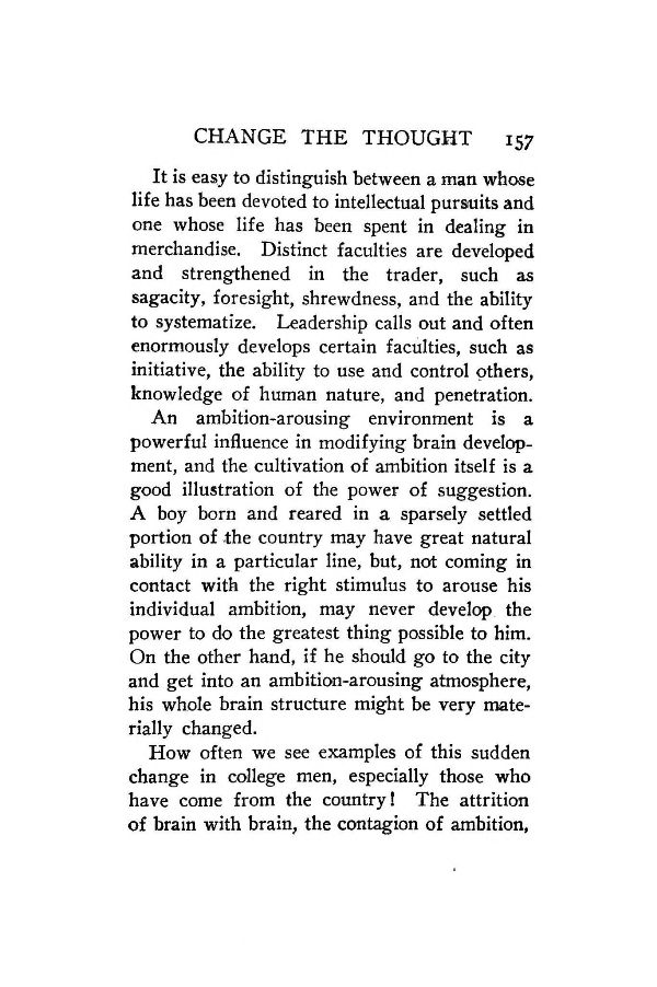 An ambition-arousing environment is a powerful influence in modifying brain development, and the cultivation of ambition itself is a good illustration of the power of suggestion. A boy born and reared in a sparsely settled portion of the country may have great natural ability in a particular line, but, not coming in contact with the right stimulus to arouse his individual ambition, may never develop the power to do the greatest thing possible to him. On the other hand, if he should go to the city and get into an ambition-arousing atmosphere, his whole brain structure might be very materially changed.