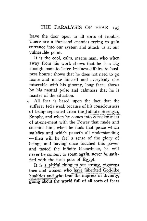 All fear is based upon the fact that the sufferer feels weak because of his consciousness of being separated from the Infinite Strength, Supply, and when he comes into consciousness of at-one-ment with the Power that made and sustains him, when he finds that peace which satisfies and which passeth all understanding -- then will he feel a sense of the glory of being; and having once touched this power and tasted the infinite blessedness, he will never be content to roam again, never be satisfied with the flesh pots of Egypt.