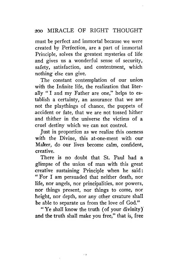 There is no doubt that St. Paul had a glimpse of the union of man with this great creative sustaining Principle when he said: "For I am persuaded that neither death, nor life, nor angels, nor principalities, nor powers, nor things present, nor things to come, nor height, nor depth, nor any other creature shall be able to separate us from the love of God."