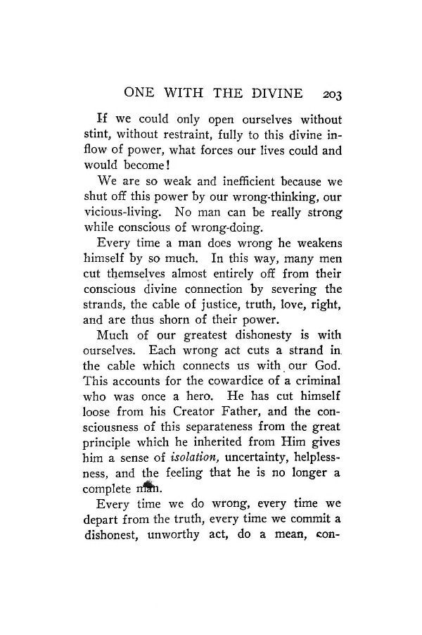 Every time a man does wrong he weakens himself by so much. In this way, many men cut themselves almost entirely off from their conscious divine connection by severing the strands, the cable of justice, truth, love, right, and are thus shorn of their power.
