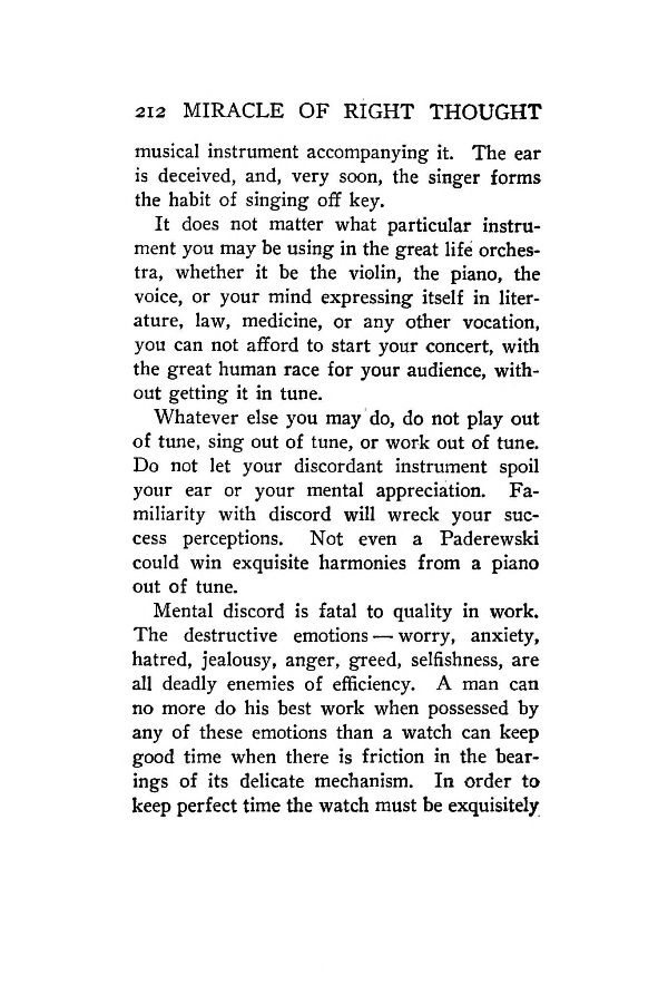 Whatever else you may do, do not play out of tune, sing out of tune, or work out of tune. Do not let your discordant instrument spoil your ear or your mental appreciation. Familiarity with discord will wreck your success perceptions. Not even a Paderewski could win exquisite harmonies from a piano out of tune.