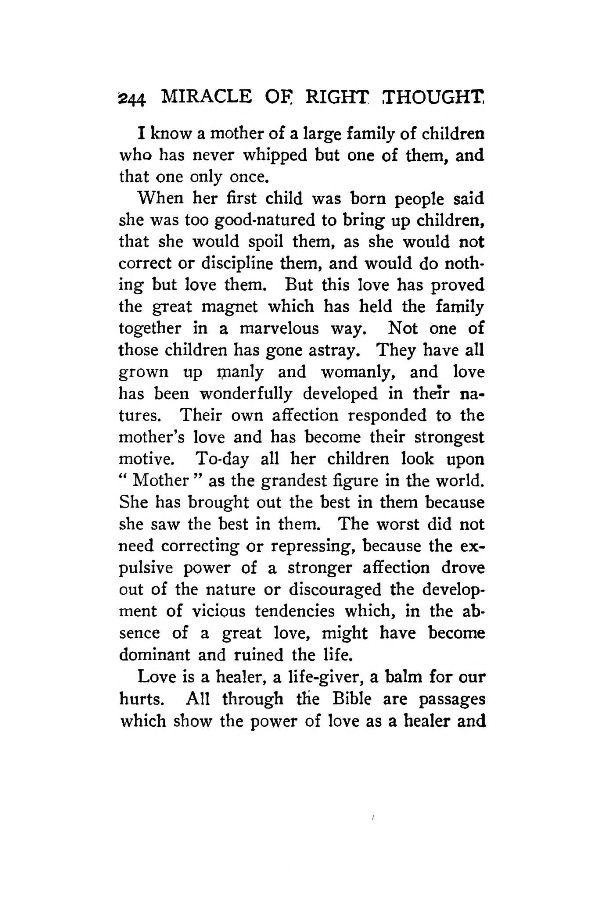 When her first child was born people said she was too good-natured to bring up children, that she would spoil them, as she would not correct or discipline them, and would do nothing but love them. But this love has proved the great magnet which has held the family together in a marvelous way. Not one of those children has gone astray. They have all grown up manly and womanly, and love has been wonderfully developed in their natures. Their own affection responded to the mother's love and has become their strongest motive. To-day all her children look upon "Mother" as the grandest figure in the world. She has brought out the best in them because she saw the best in them. The worst did not need correcting or repressing, because the expulsive power of a stronger affection drove out of the nature or discouraged the development of vicious tendencies which, in the absence of a great love, might have become dominant and ruined the life.
