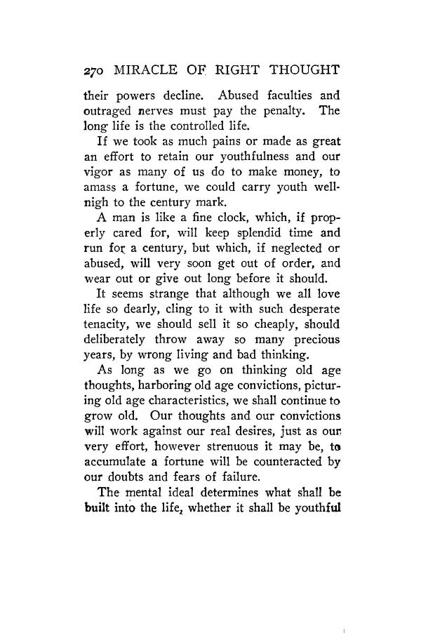 As long as we go on thinking old age thoughts, harboring old age convictions, picturing old age characteristics, we shall continue to grow old. Our thoughts and our convictions will work against our real desires, just as our, very effort, however strenuous it may be, to accumulate a fortune will be counteracted by our doubts and fears of failure.