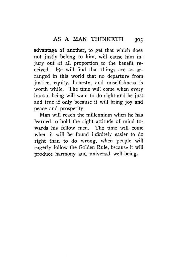 Man will reach the millennium when he has learned to hold the right attitude of mind towards his fellow men. The time will come when it will be found infinitely easier to do right than to do wrong, when people will eagerly follow the Golden Rule, because it will produce harmony and universal well-being.