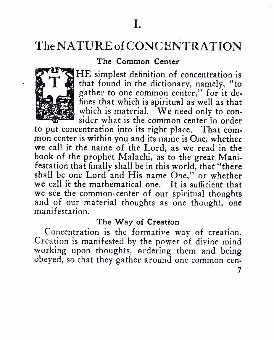 THE simplest definition of concentration is that found in the dictionary, namely, “to gather to one common center,” for it defines that which is spiritual as well as that which is material.