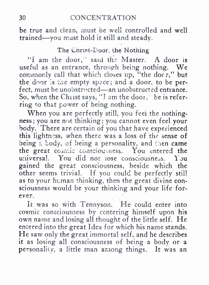 “I am the door," said the Master. A door is useful as an entrance, through being nothing. We commonly call that which closes up, “the doer,” but the door is the empty space; and a door, to be perfect, must be unobstructed--an unobstructed entrance. So, when the Christ says, "I am the door,’ he is referring to that power of being nothing.