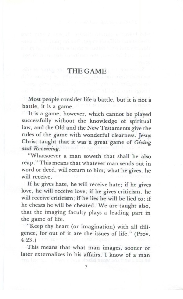 Most people consider life a battle, but it is not a battle, it is a game. It is a game, however, which cannot be played successfully without the knowledge of spiritual law, and the Old and the New Testaments give the rules of the game with wonderful clearness. Jesus Christ taught that it was a great game of Giving and Receiving.