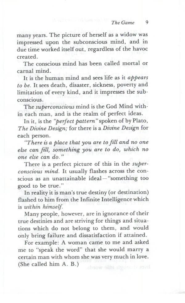 The Game - Law of Prosperity - Power of the Word - Law of Nonresistance - Law of Karma and the Law of Forgiveness - Casting the Burden (Impressing the Subconscious) - Love - Intuition or Guidance - Perfect Self-Expression or the Divine Design - Denials and Affirmations - Contents -