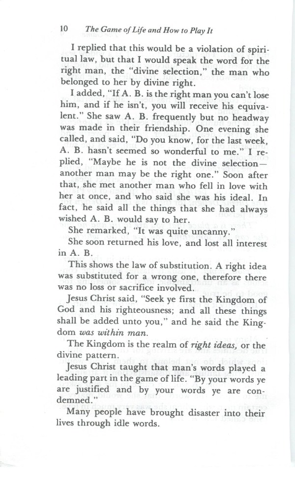 I replied that this would be a violation of spiritual law, but that I would speak the word for the right man, the "divine selection," the man who belonged to her by divine right.