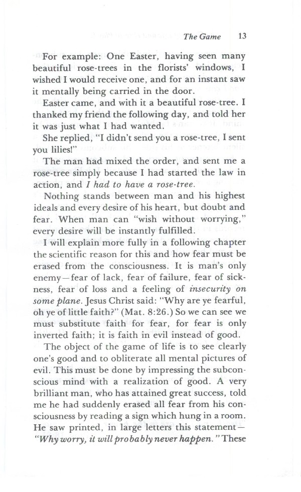 For example: One Easter, having seen many beautiful rose-trees in the florists' windows, I wished I would receive one, and for an instant saw it mentally being carried in the door.