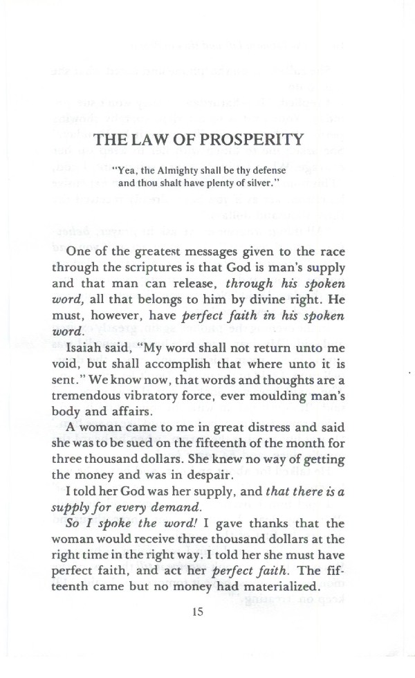 So I spoke the word! I gave thanks that the woman would receive three thousand dollars at the right time in the right way. I told her she must have perfect faith, and act her perfect faith. The fifteenth came but no money had materialized.