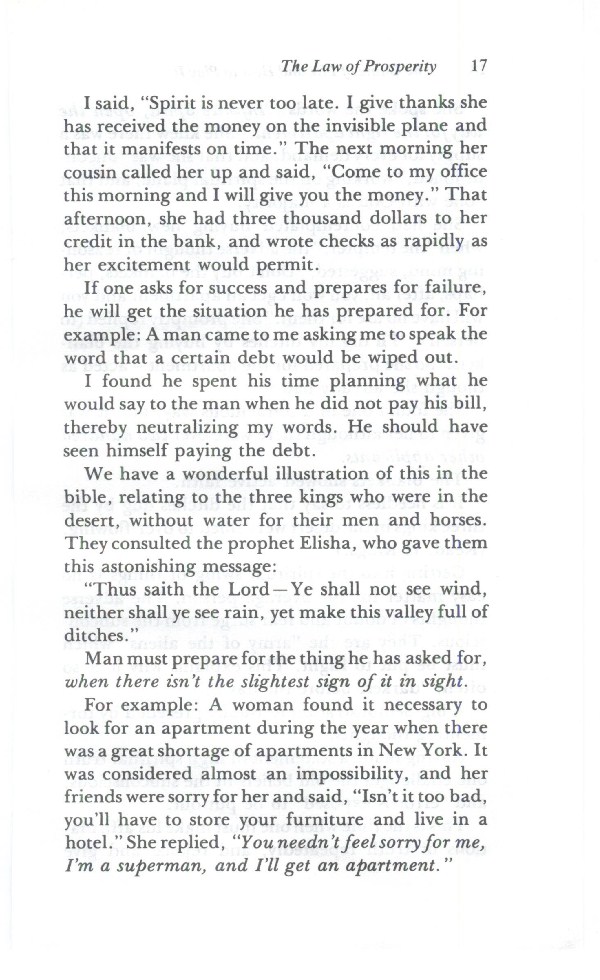 I said, "Spirit is never too late. I give thanks she has received the money on the invisible plane and that it manifests on time." The next morning her cousin called her up and said, "Come to my office this morning and I will give you the money." That afternoon, she had three thousand dollars to her credit in the bank, and wrote checks as rapidly as her excitement would permit.