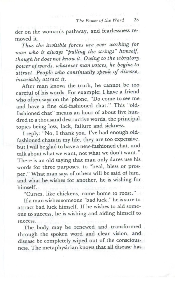 After man knows the truth, he cannot be too careful of his words. For example: I have a friend who often says on the 'phone, "Do come to see me and have an old-fashioned chat." This "old-fashioned chat" means an hour of about five hundred to a thousand destructive words, the principal topics being loss, lack, failure and sickness.