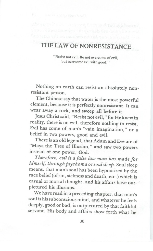 Jesus Christ said, "Resist not evil," for He knew in reality, there is no evil, therefore nothing to resist. Evil has come of man's "vain imagination," or a belief in two powers, good and evil.