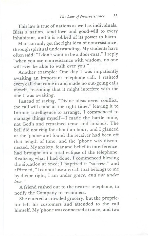 Instead of saying, "Divine ideas never conflict, the call will come at the right time," leaving it to Infinite Intelligence to arrange, I commenced to manage things myself - I made the battle mine, not God's and remained tense and anxious. The bell did not ring for about an hour, and I glanced at the 'phone and found the receiver had been off that length of time, and the 'phone was disconnected. My anxiety, fear and belief in interference, had brought on a total eclipse of the telephone. Realizing what I had done, I commenced blessing the situation at once; I baptized it "success," and affirmed, "I cannot lose any call that belongs to me by divine right; I am under grace, and not under law."
