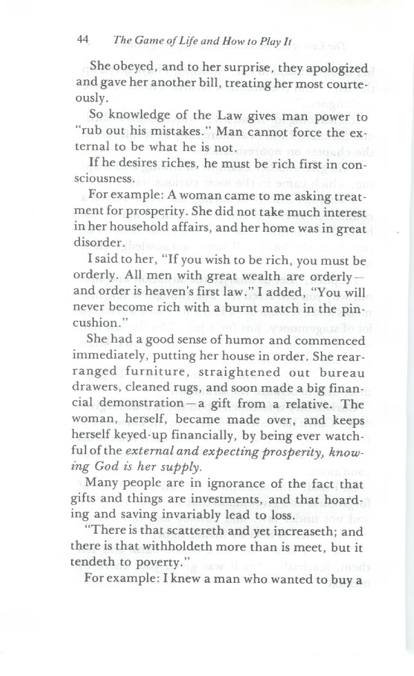 The Game - Law of Prosperity - Power of the Word - Law of Nonresistance - Law of Karma and the Law of Forgiveness - Casting the Burden (Impressing the Subconscious) - Love - Intuition or Guidance - Perfect Self-Expression or the Divine Design - Denials and Affirmations - Contents -