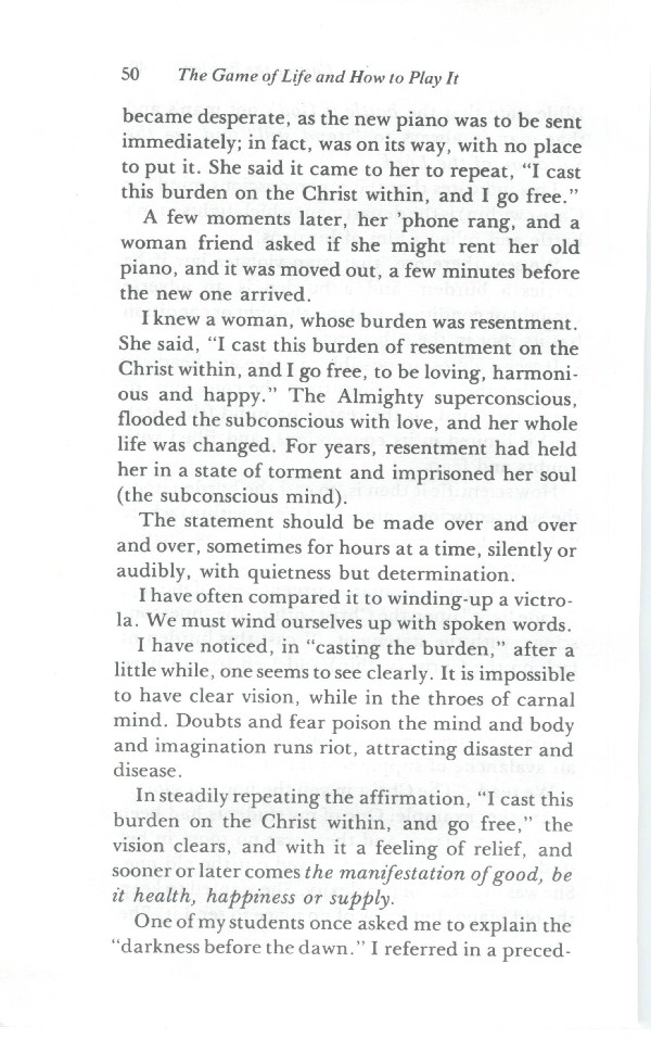 became desperate, as the new piano was to be sent immediately; in fact, was on its way, with no place to put it. She said it came to her to repeat, "I cast this burden on the Christ within, and I go free."