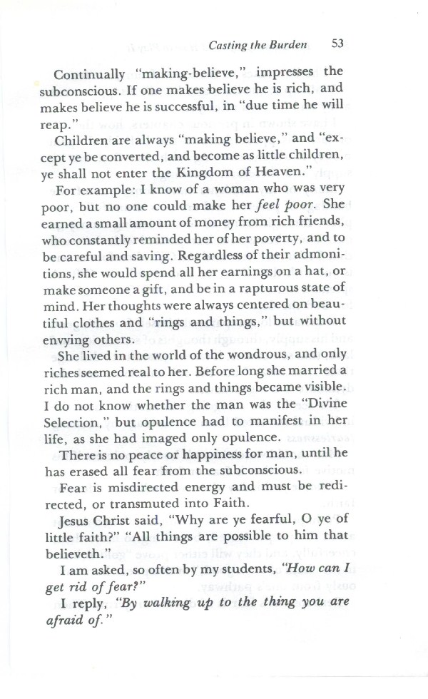 For example: I know of a woman who was very poor, but no one could make her feel poor. She earned a small amount of money from rich friends, who constantly reminded her of her poverty, and to be careful and saving. Regardless of their admonitions, she would spend all her earnings on a hat, or make someone a gift, and be in a rapturous state of mind. Her thoughts were always centered on beautiful clothes and "rings and things," but without envying others.