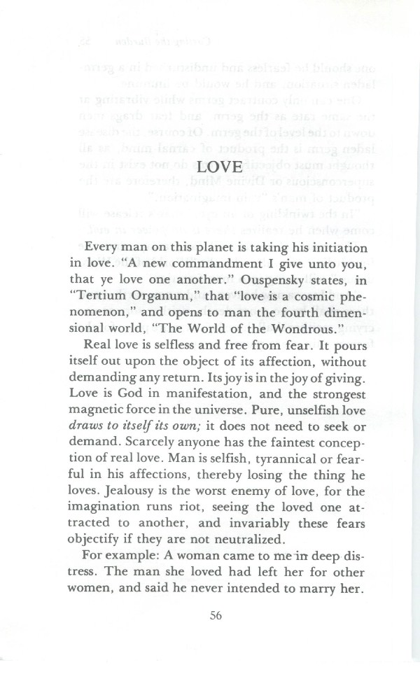 Real love is selfless and free from fear. It pours itself out upon the object of its affection, without demanding any return. Its joy is in the joy of giving. Love is God in manifestation, and the strongest magnetic force in the universe. Pure, unselfish love draws to itself its own; it does not need to seek or demand. Scarcely anyone has the faintest conception of real love. Man is selfish, tyrannical or fearful in his affections, thereby losing the thing he loves. Jealousy is the worst enemy of love, for the imagination runs riot, seeing the loved one attracted to another, and invariably these fears objectify if they are not neutralized.