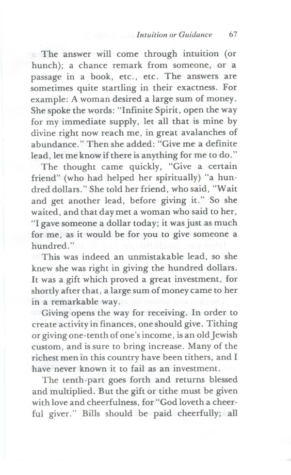 The answer will come through intuition (or hunch); a chance remark from someone, or a passage in a book, etc., etc. The answers are sometimes quite startling in their exactness. For example: A woman desired a large sum of money. She spoke the words: "Infinite Spirit, open the way for my immediate supply, let all that is mine by divine right now reach me, in great avalanches of abundance." Then she added: "Give me a definite lead, let me know if there is anything for me to do."