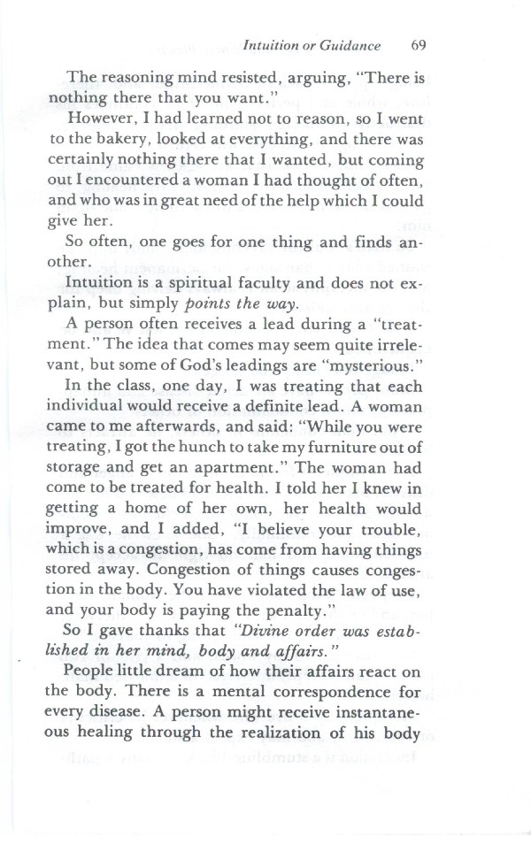 In the class, one day, I was treating that each individual would receive a definite lead. A woman came to me afterwards, and said: "While you were treating, I got the hunch to take my furniture out of storage and get an apartment." The woman had come to be treated for health. I told her I knew in getting a home of her own, her health would improve, and I added, "I believe your trouble, which is a congestion, has come from having things stored away. Congestion of things causes congestion in the body. You have violated the law of use, and your body is paying the penalty."