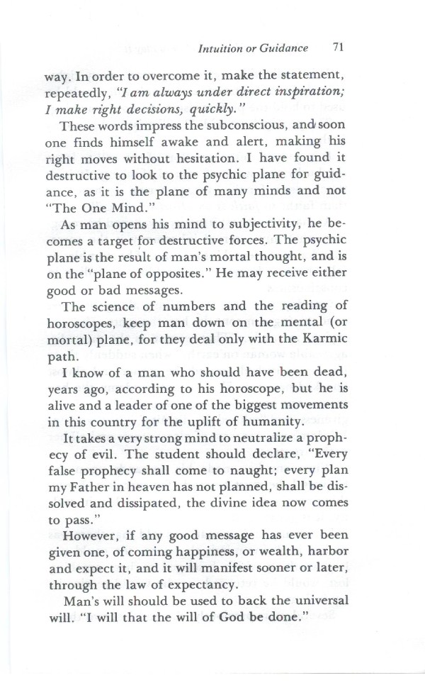 These words impress the subconscious, and soon one finds himself awake and alert, making his right moves without hesitation. I have found it destructive to look to the psychic plane for guidance, as it is the plane of many minds and not the "The One Mind."