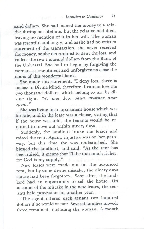 She made this statement, "I deny loss, there is no loss in Divine Mind, therefore, I cannot lose the two thousand dollars, which belong to me by divine right. "As one door shuts another door opens."