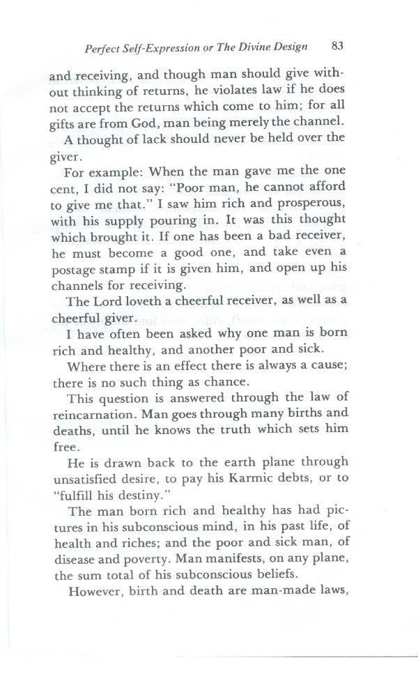For example: When the man gave the one cent, I did not say; "Poor man, he cannot afford to give me that." I saw him rich and prosperous, with his supply pouring in. It was this thought which brought it. If one has been a bad receiver, he must become a good one, and take even a postage stamp if it is given him, and open up his channels for receiving.