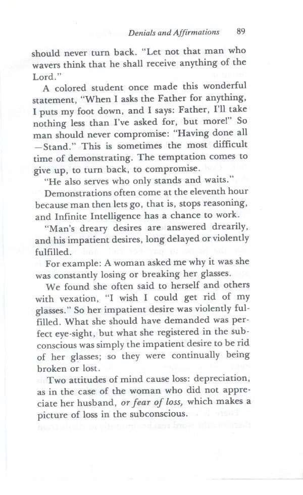 We found she often said to herself and others with vexation, "I wish I could get rid of my glasses." So her impatient desire was violently fulfilled. What she should have demanded was perfect eye-sight, but what she registered in the subconscious was simply the impatient desire to be rid of her glasses; so they were continually being broken or lost.