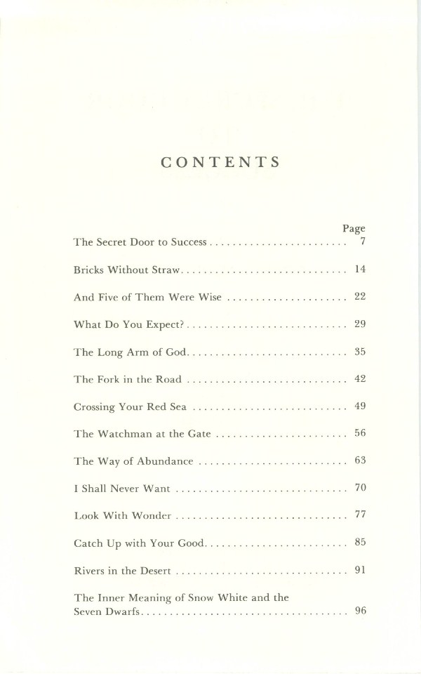 The Secret Door to Success - Bricks Without Straw - And Five of Them Were Wise - What Do You Expect? - The Long Arm of God - The Fork in the Road - Crossing Your Red Sea - Watchman at the Gate - Way of Abundance - I Shall Never Want - Look With Wonder - Catch Up with Your Good - Rivers in the Desert - The Inner Meaning of Snow White and the Seven Dwarves - Contents -