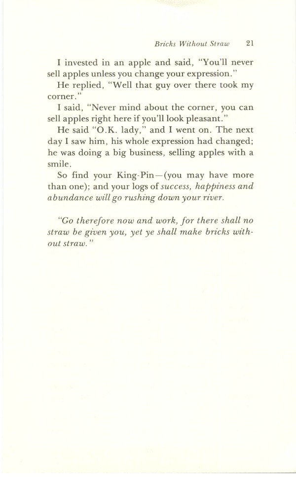 He said, "O.K. lady," and I went on. The next day I saw him, his whole expression had changed. He was doing a big business selling apples with a smile.