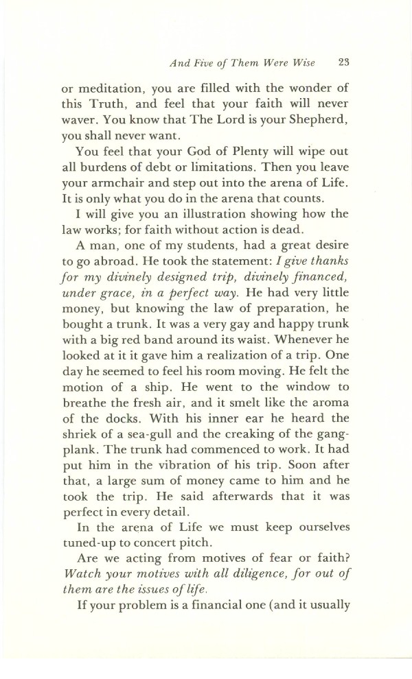 A man, one of my students, had a great desire to go abroad. He took the statement: I give thanks for my divinely designed trip, divinely financed, under grace, in a perfect way. He had very little money, but knowing the law of preparation, he bought a trunk. It was a very gay and happy trunk with a big red band around its waist. Whenever he looked at it it gave him a realization of a trip.