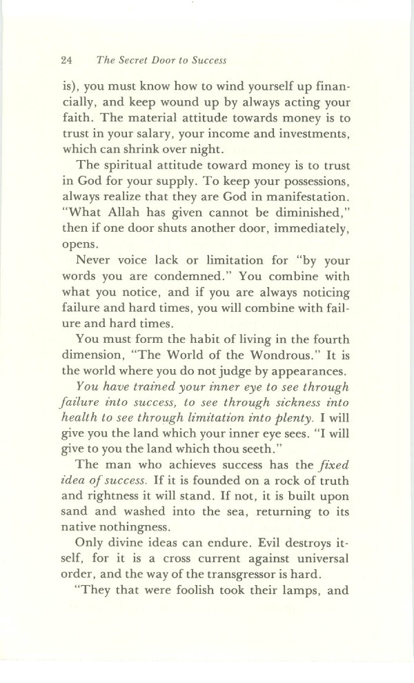 The Secret Door to Success - Bricks Without Straw - And Five of Them Were Wise - What Do You Expect? - The Long Arm of God - The Fork in the Road - Crossing Your Red Sea - Watchman at the Gate - Way of Abundance - I Shall Never Want - Look With Wonder - Catch Up with Your Good - Rivers in the Desert - The Inner Meaning of Snow White and the Seven Dwarves - Contents -