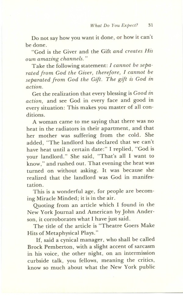 A woman came to me saying that there was no heat in the radiators in their apartment, and that her mother was suffering from the cold. She added, "The landlord has declared that we can't have heat until a certain date." I replied, "God is your landlord." She said, "That's all I want to know," and rushed out. That evening the heat was turned on without asking. It was because she realized that the landlord was God in manifestation.