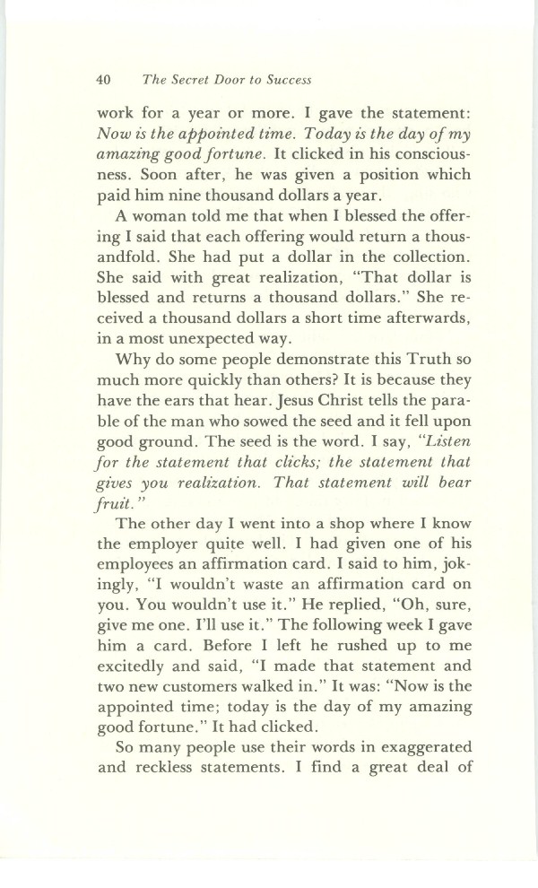 The other day I went into a shop where I know the employer quite well. I had given one of his employees an affirmation card. I said to him, jokingly, "I wouldn't waste an affirmation card on you. You wouldn't use it." He replied, "Oh sure, give me one. I'll use it." The following week I gave him a card. Before I left he rushed up to me excitedly and said, "I made the statement and two new customers walked in." It was: "Now is the appointed time; today is the day of my amazing good fortune." It had clicked.