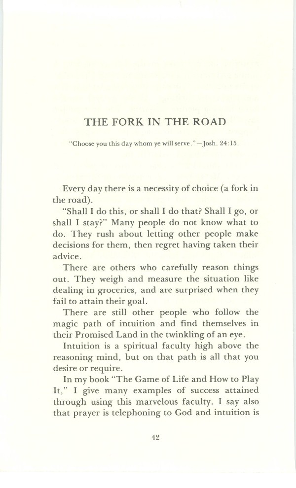 In my book "The Game of Life and How to Play It" I give many examples of success attained through using this marvelous faculty. I say also that prayer is telephoning to God and intuition is