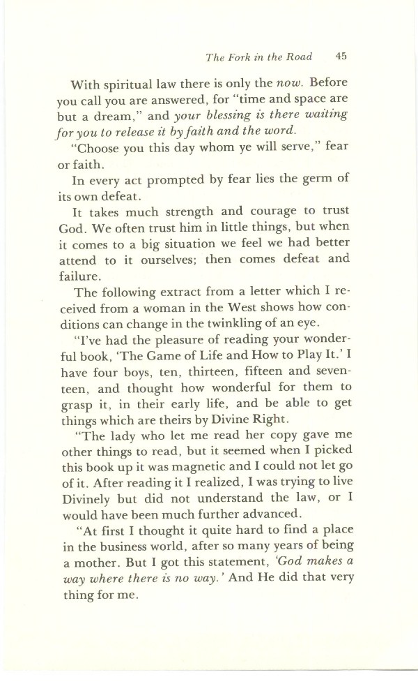 "I've had the pleasure of reading your wonderful book, 'The Game of Life and How to Play It.' I have four boys, ten, thirteen, fifteen and seventeen, and thought how wonderful for them to grasp it, in their early life, and be able to get things which are theirs by Divine Right.