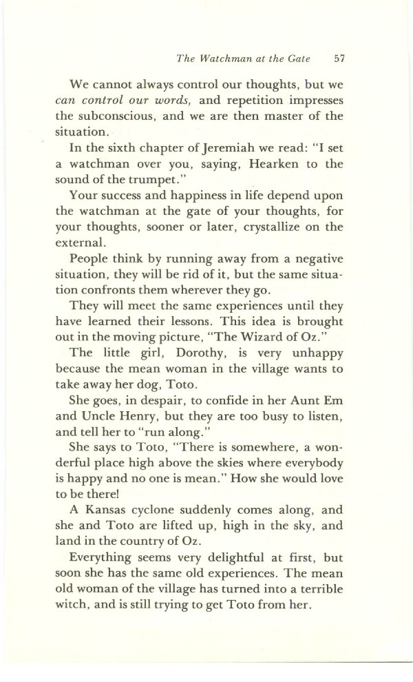 The Secret Door to Success - Bricks Without Straw - And Five of Them Were Wise - What Do You Expect? - The Long Arm of God - The Fork in the Road - Crossing Your Red Sea - Watchman at the Gate - Way of Abundance - I Shall Never Want - Look With Wonder - Catch Up with Your Good - Rivers in the Desert - The Inner Meaning of Snow White and the Seven Dwarves - Contents -