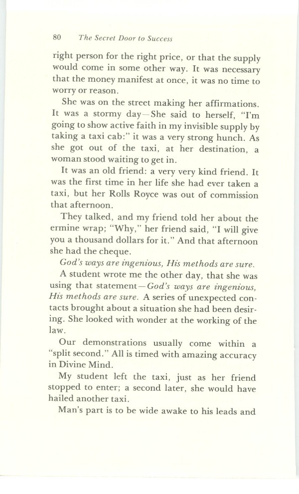 She was on the street making her affirmations. It was a stormy day. She said to herself, "I'm going to show active faith in my invisible supply by taking a taxi cab." It was a very strong hunch. As she got out of the taxi, at her destination, a woman stood waiting to get in.