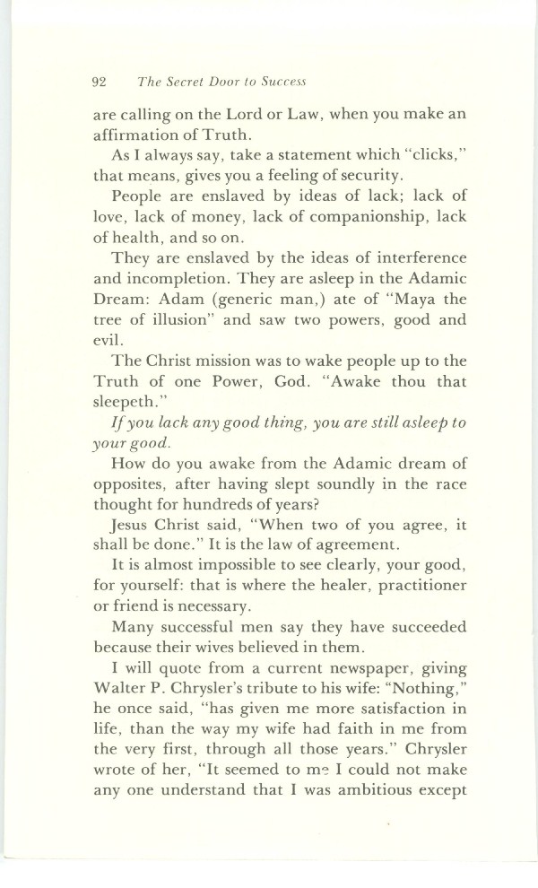 The Secret Door to Success - Bricks Without Straw - And Five of Them Were Wise - What Do You Expect? - The Long Arm of God - The Fork in the Road - Crossing Your Red Sea - Watchman at the Gate - Way of Abundance - I Shall Never Want - Look With Wonder - Catch Up with Your Good - Rivers in the Desert - The Inner Meaning of Snow White and the Seven Dwarves - Contents -