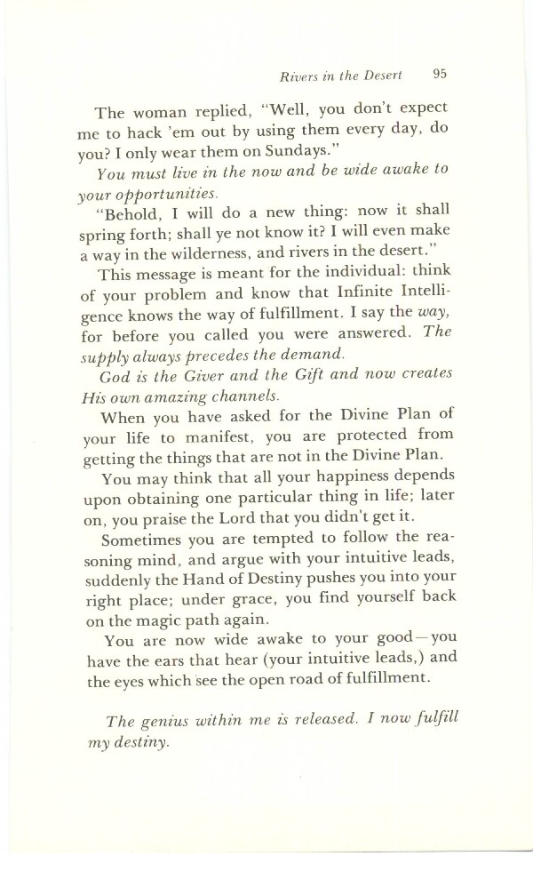 The Secret Door to Success - Bricks Without Straw - And Five of Them Were Wise - What Do You Expect? - The Long Arm of God - The Fork in the Road - Crossing Your Red Sea - Watchman at the Gate - Way of Abundance - I Shall Never Want - Look With Wonder - Catch Up with Your Good - Rivers in the Desert - The Inner Meaning of Snow White and the Seven Dwarves - Contents -