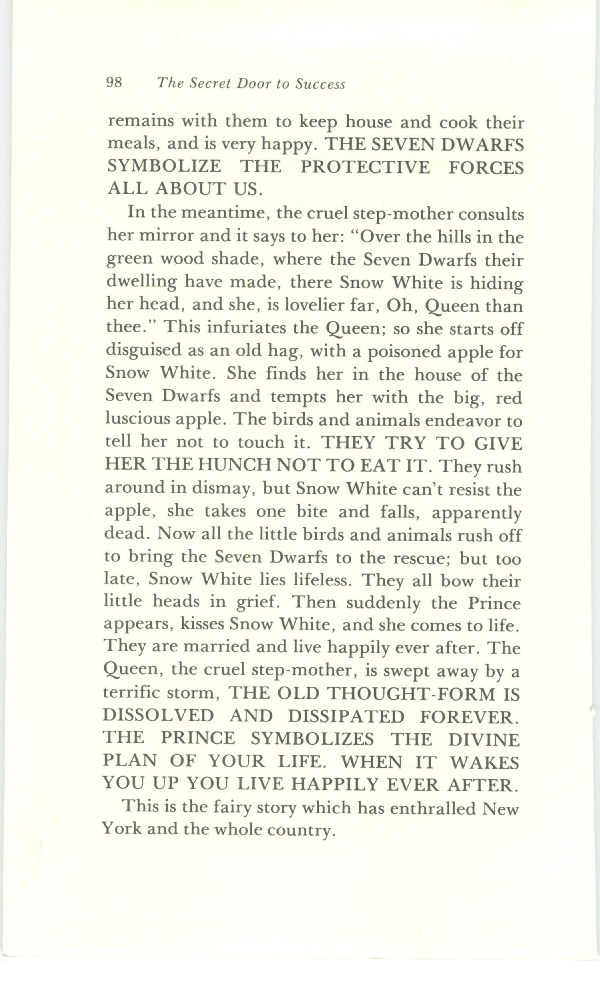 In the meantime, the cruel step-mother consults her mirror and it says to her: "Over the hills in the green wood shade, where the Seven Dwarfs their dwelling have made, there Snow White is hiding her head, and she, is lovelier far, Oh, Queen than thee." This infuriates the Queen; so she starts off disguised as an old hag, with a poisoned apple for Snow White. She finds her in the house of the Seven Dwarfs and tempts her with the big, red luscious apple. The birds and animals endeavor to tell her not to touch it. THEY TRY TO GIVE HER THE HUNCH NOT TO EAT IT. They rush around in dismay, but Snow White can't resist the apple, she takes one bite and falls, apparently dead. Now all the little birds and animals rush off to bring the Seven Dwarfs to the rescue; but too late, Snow White lies lifeless. They all bow their little heads in grief. Then suddenly the Prince appears, kisses Snow White, and she comes to life. They are married and live happily ever after. The Queen, the cruel step-mother, is swept away by a terrific storm, THE OLD THOUGHT-FORM IS DISSOLVED AND DISSIPATED FOREVER. THE PRINCE SYMBOLIZES THE DIVINE PLAN OF YOUR LIFE. WHEN IT WAKES YOU UP YOU LIVE HAPPILY EVER AFTER.