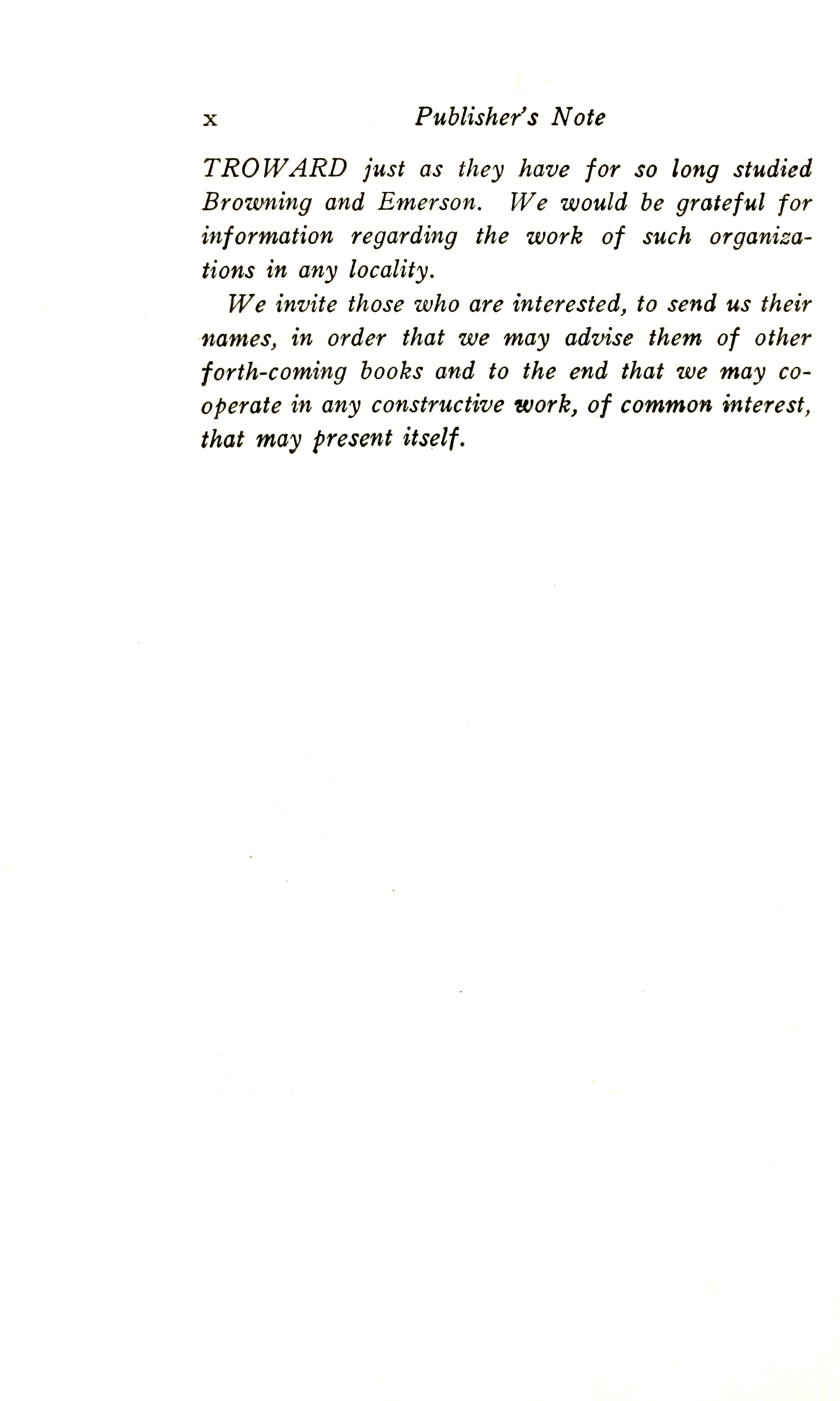 It is significant to note that societies, study clubs and classes are now taking up the study of Troward, just as they have for so long studied Browning and Emerson.