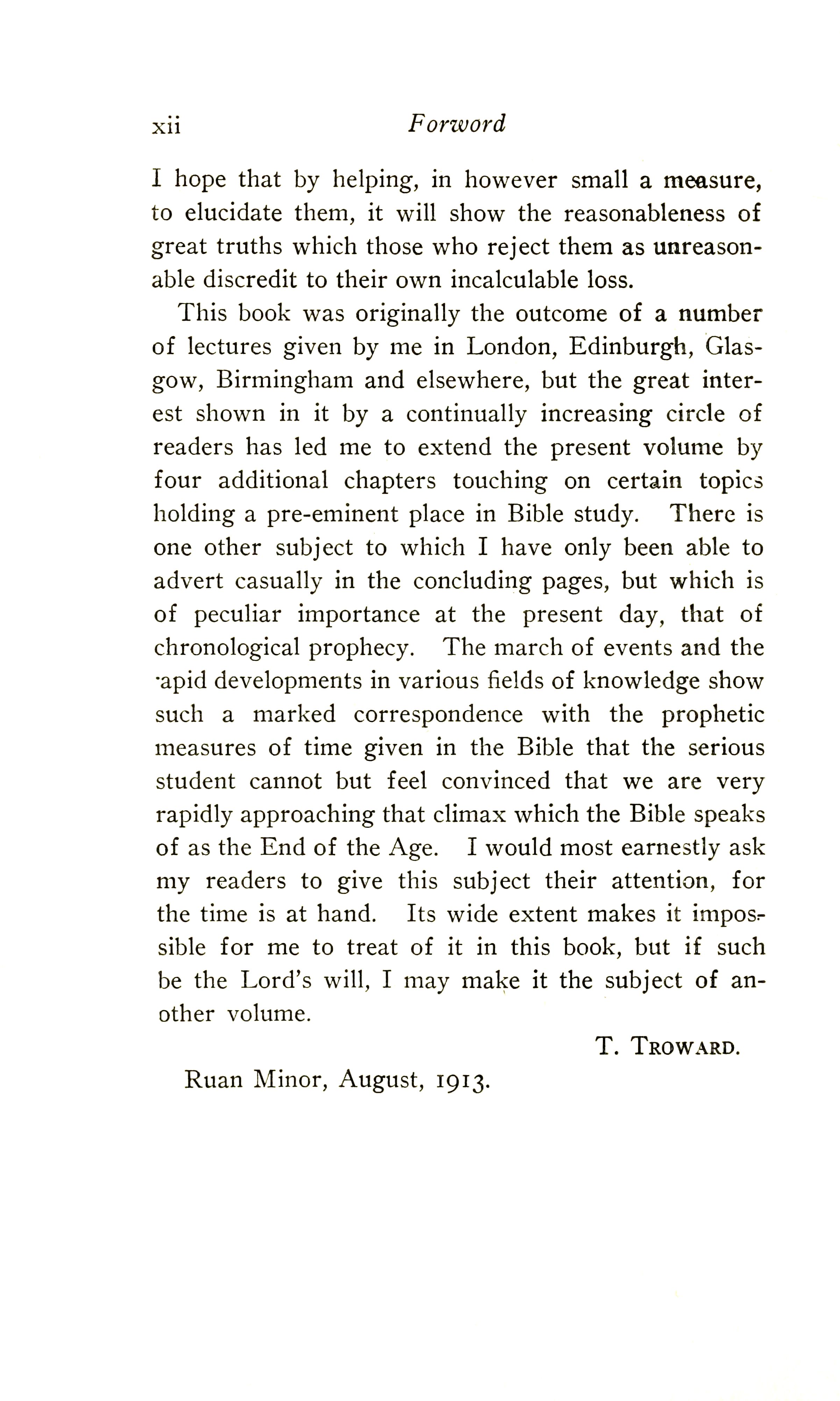 This book was originally the outcome of a number of lectures given by me in London, Edinburgh, Glasgow, Birmingham and elsewhere, but the great interest shown in it by a continually increasing circle of readers has led me to extend the present volume by four additional chapters touching on certain topics holding a pre-eminent place in Bible study. There is one other subject to which I have only been able to advert casually in the concluding pages, but which is of peculiar importance at the present day, that of chronological prophecy. The march of events and the rapid developments in various fields of knowledge show such a marked correspondence with the prophetic measures of time given in the Bible that the serious student cannot but feel convinced that we are very rapidly approaching that climax which the Bible speaks of as the End of the Age. I would most earnestly ask my readers to give this subject their attention, for the time is at hand. Its wide extent makes it impossible for me to treat of it in this book, but if such be the Lord's will, I may make it the subject of another volume.