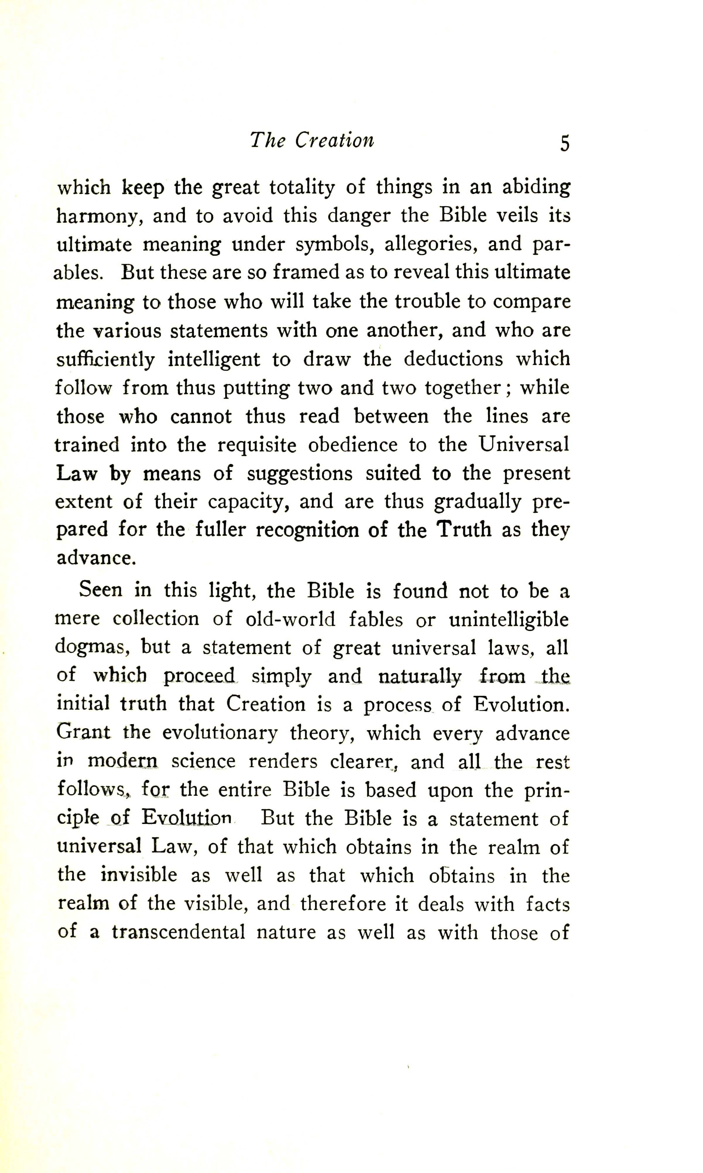 Seen in this light, the Bible is found not to be a mere collection of old-world fables or unintelligible dogmas, but a statement of great universal laws, all of which proceed simply and naturally from the initial truth that Creation is a process of Evolution. Grant the evolutionary theory, which every advance in modern science renders clearer, and all the rest follows, for the entire Bible is based upon the principle of Evolution. But the Bible is a statement of Universal law, of that which obtains in the realm of the invisible as well as that which obtains in the realm of the visible, and therefore it deals with the facts of a transcendental nature as well as with those of