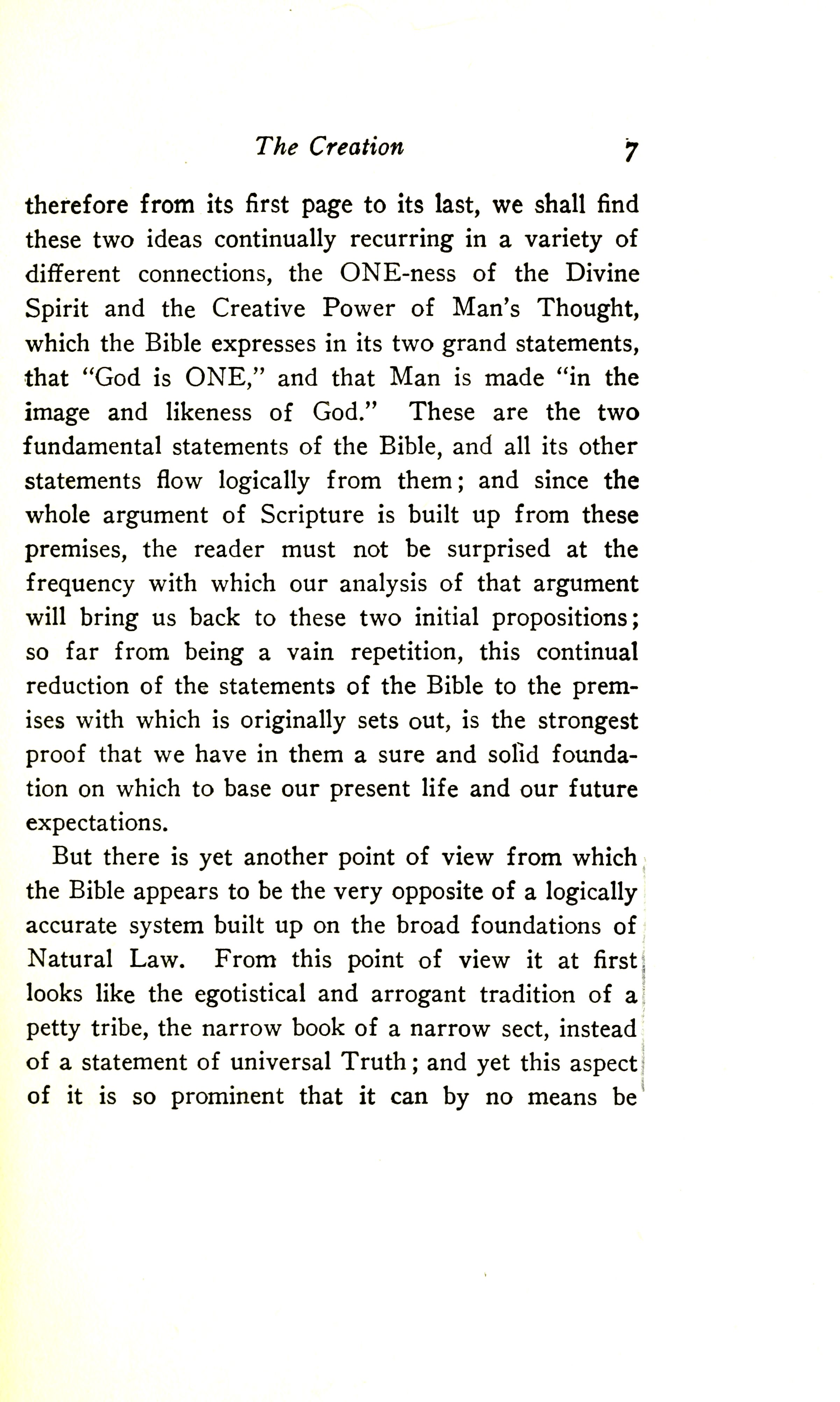 therefore from its first page to its last, we shall find these two ideas continually recurring in a variety of different connections: the ONE-ness of the Divine Spirit and the Creative Power of man's Thought, which the Bible expresses in its two grand statements, that "God is ONE", and that Man is made "in the image and likeness of God".