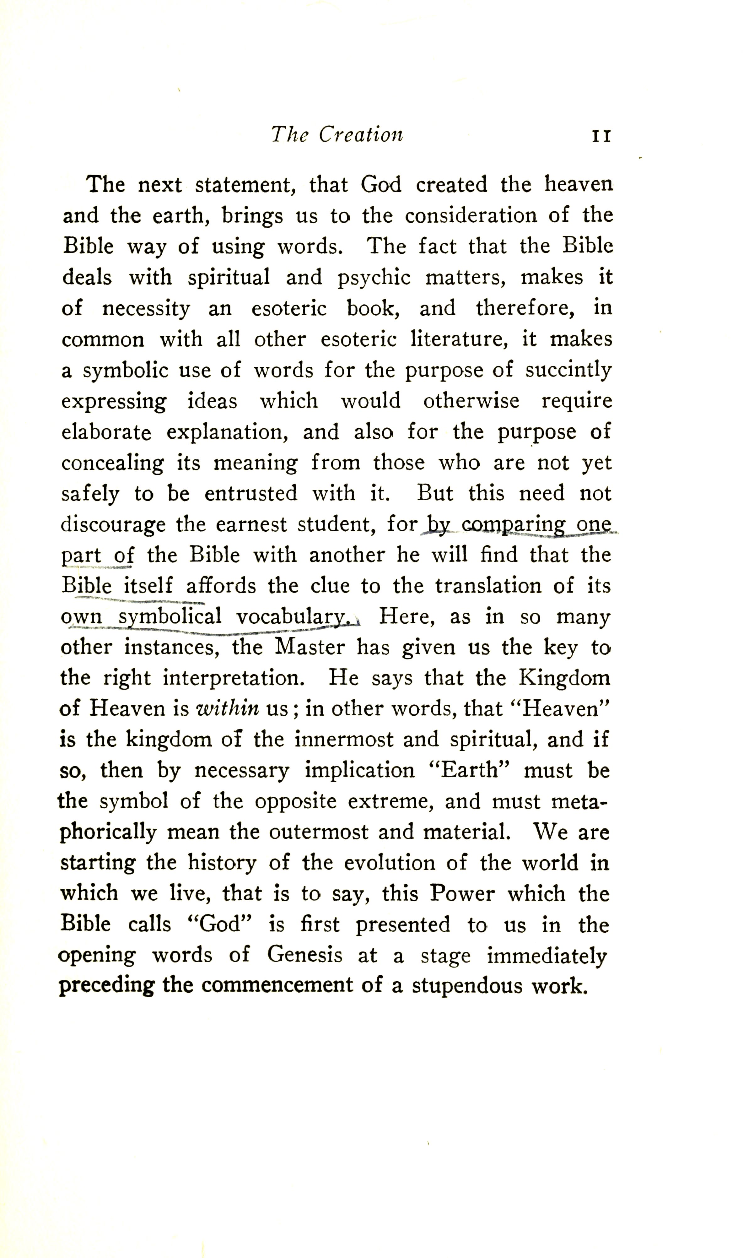 The next statement --- that God created the heaven and the earth --- brings us to the consideration of the Bible way of using words. The fact that the Bible deals with spiritual and psychic matters makes it of necessity an esoteric book, and therefore, in common with all other esoteric literature, it makes a symbolic use of words for the purpose of succinctly expressing ideas which would otherwise require elaborate explanation, and also for the purpose of concealing its meaning from those who are not yet safely to be entrusted with it. But this need not discourage the earnest student, for by comparing one part of the Bible with another he will find that the Bible itself affords the clue to the translation of its own symbolical vocabulary.