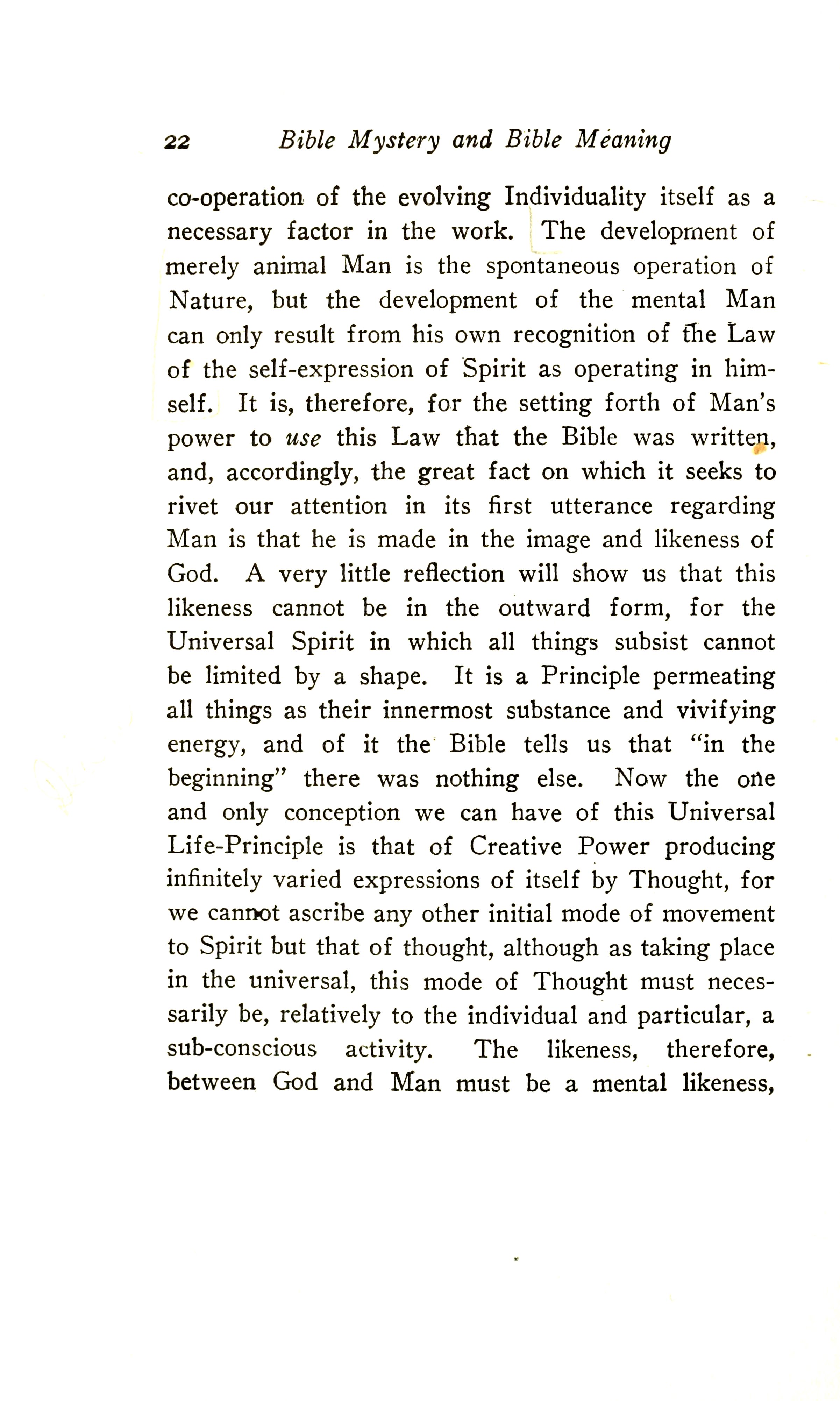 It is, therefore, for the setting forth of Man's power to use this Law that the Bible was written; and accordingly, the great fact on which it seeks to rivet our attention in its first utterance regarding Man is that he is made in the image and likeness of God. A very little reflection will show us that this likeness cannot be in the outward form, for the Universal Spirit in which all things subsist cannot be limited by shape. It is a Principle permeating all things as their innermost substance and vivifying energy, and of it the Bible tells us that "in the beginning" there was nothing else.