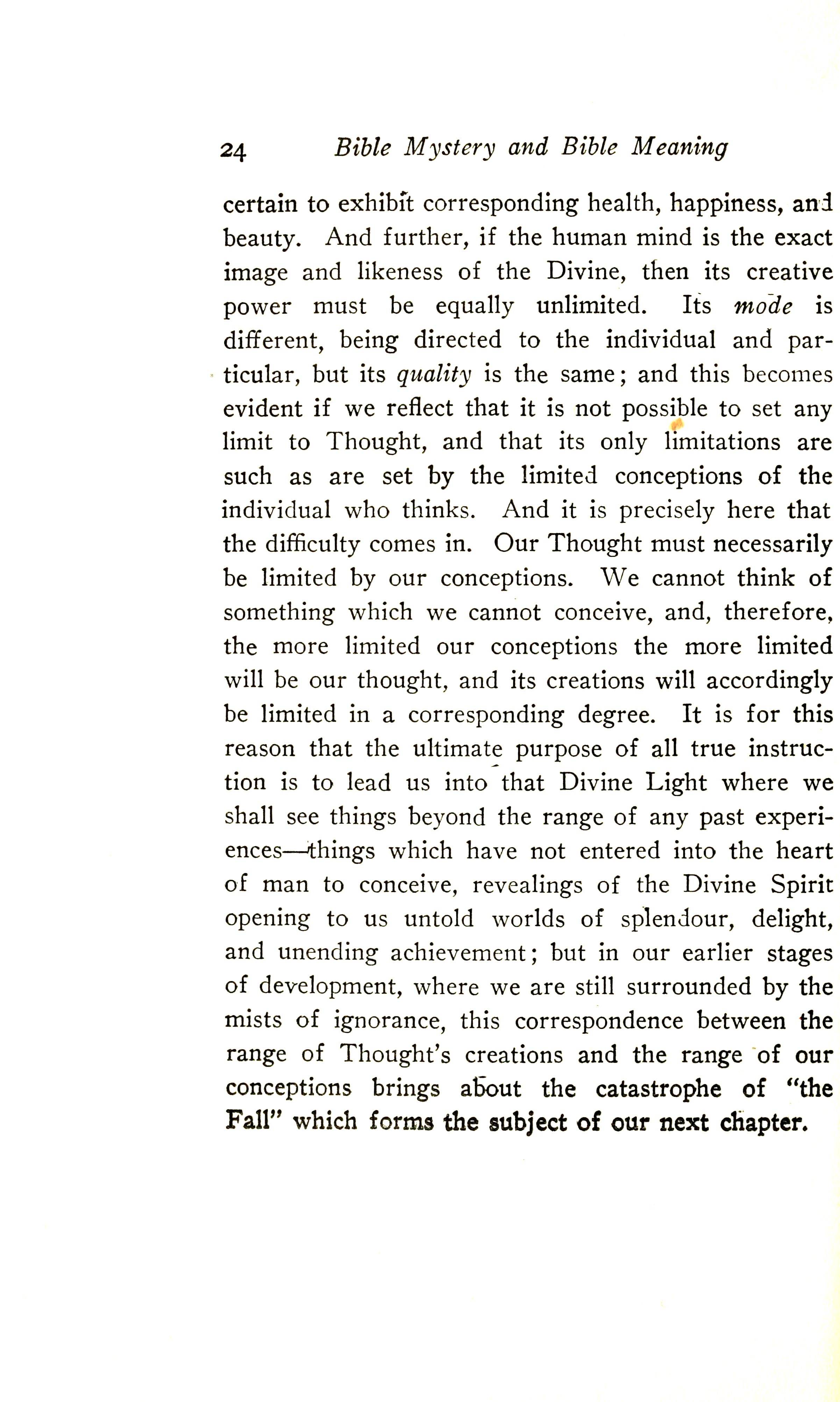 It is for this reason that the ultimate purpose of all true instruction is to lead us into that Divine Light where we shall see things beyond the range of any past experiences --- things which have not emerged into the heart of man to conceive, revealings of the Divine Spirit opening to us untold worlds of splendour, delight, and unending achievement. But in our earlier stages of development, where we are still surrounded by the mists of ignorance, this correspondence between the range of Thought's creations and the range of our conceptions brings about the catastrophe of "the Fall", which forms the subject of our next chapter.