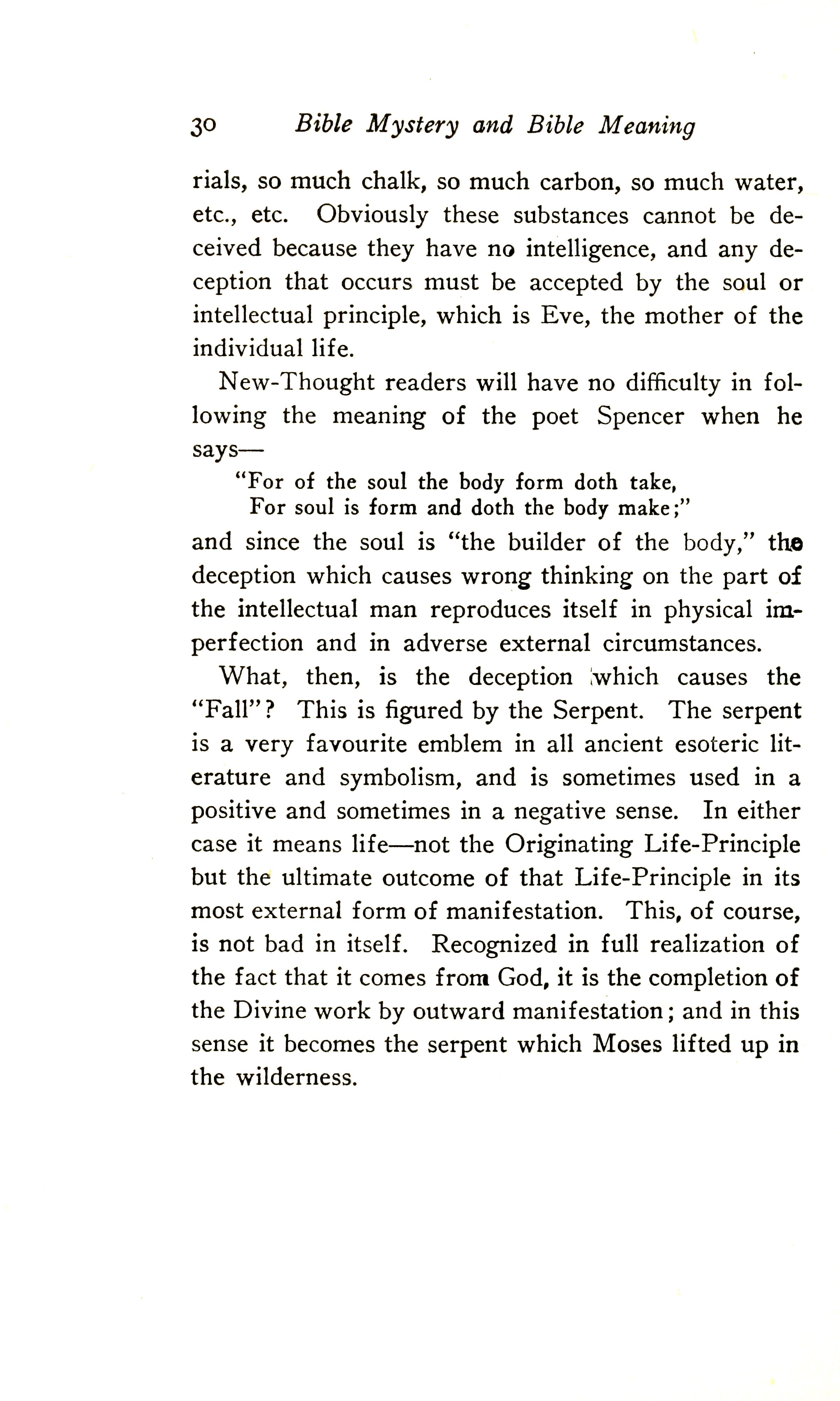 materials --- so much chalk, so much carbon, so much water, etc. Obviously these substances cannot be deceived because they have no intelligence, and any deception that occurs must be accepted by the soul or intellectual principle, which is Eve, the mother of the individual life. New Thought readers will have no difficulty in following the meaning of the poet Spenser when he says: